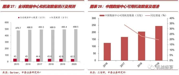 全球数据中心量减体增,中国数据中心机架数量快速增长,大型数据中心发展迅速。根据Gartner的预测,全球数据中心的数量将从2015年的45万个降低至2020年的42.2万个;而机架数量将从2015年的479.7万个增加至2020年的498.5万个。根据Synergy Research的数据显示,2018年全球超大规模供应商运营的大型数据中心数量增长了11%,数据中心正向着更大规模的趋势发展。根据工信部的数据显示,2019年我国数据中心可用机架数量为244万架,较2016年增长120万架。作为数据中心重要组成部分和规模划分依据,机架数量的增长有助于我国数据中心整体建设以及规模以上数据中心占比的提升。