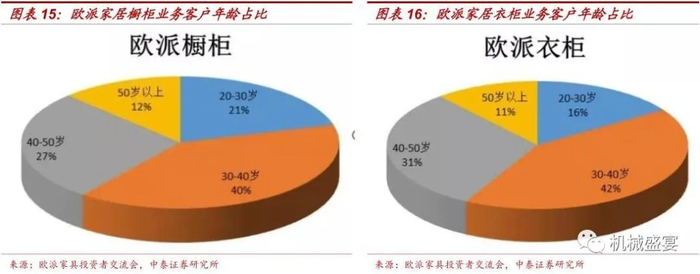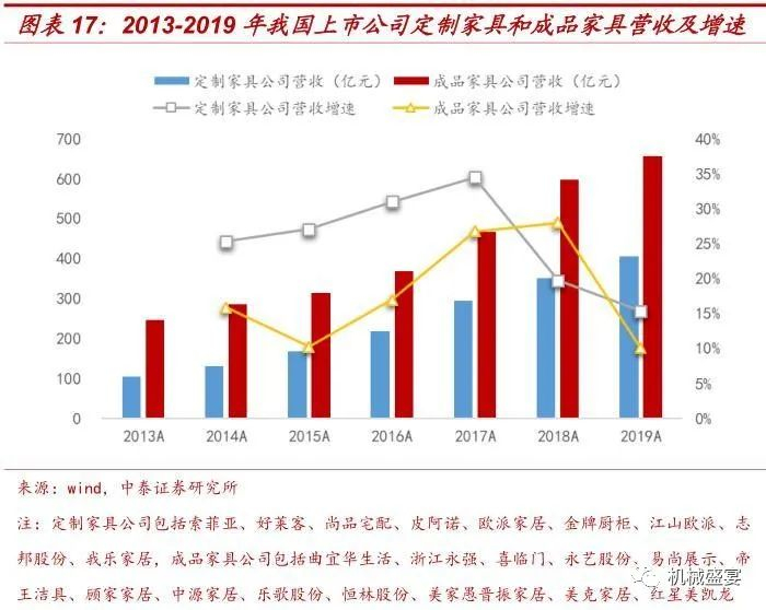 家具个性化、时尚化需求带动下,我国定制家具行业快速发展,带动设备柔性化生产需求。以欧派家居的客户年龄分布为例,欧派厨柜业务客户年龄占比最大的是30-40岁,占比40%;欧派衣柜业务客户年龄占比最大的也是30-40岁,占比42%;30-40岁消费者多为80后,他们对生活多追求个性化、时尚化,故带动了定制家具的消费。我们统计24家家具上市公司,其中有9家主营为定制家具业务,15家主营成品家具业务,9家定制家具公司2013-2019年的营收复合增速为23.76%,远高于15家成品家具公司16.36%的复合增速。根据前瞻产业研究院数据,我国定制家具在家具行业的渗透率整体约30%,对比美国、韩国等发达国家60%-70%的渗透率,仍有较大提升空间。受定制行业的快速发展影响,家具企业对于定制家具柔性化生产线的需求量增加。