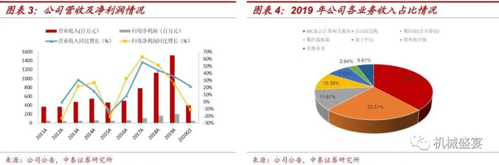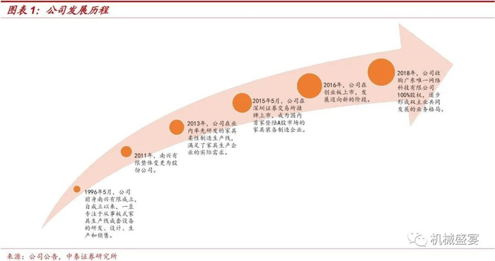 公司深耕板式家具机械二十四年,部分产品已达到国际先进水平,布局IDC运营实现双轮驱动。公司前身南兴有限成立于1996年,自成立以来,一直专注于从事板式家具生产线成套设备的研发、设计、生产和销售。2011年,南兴有限整体变更为股份公司。2015年5月,公司在深圳证券交易所挂牌上市,成为国内首家登陆A股市场的家具装备制造企业。公司是国内板式家具生产设备的领军企业,在板式家具机械研发生产上已经积累了二十四年的行业经验,众多产品在技术上已处于国内领先水平,部分产品已达到国际同类产品先进水平,完全可以替代进口设备。此外,公司于2018年3月通过发行股份及支付现金的方式收购广东唯一网络科技有限公司100%股权,进军IDC及云计算相关服务领域。公司目前已形成双主业共同发展的业务格局,从而有利于优势互补,进一步提升公司的抗风险能力和可持续发展能力。