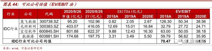 (2)IDC机柜在交付之后会产生大量折旧费用,短期净利润较低,所以使用EV/EBITDA模型对IDC业务进行估值。假设条件:①公司采用非公开发行募资7.9亿元建设沙田绿色工业云数据产业基地,叠加每年专业设备现金盈利,预计可以满足未来机柜建设投资,所以假设公司不再扩大债务比例,债务净额占公司价值(EV)比例在历史水平20-30%之间;②假设IDC业务2020年净利率17%左右(唯一网络历史净利率在17-30%之间,同行历史净利率在11-22%之间),税率为15%,可测算2020年公司IDC运营业务EBITDA约为3.26亿元。可比公司平均EV/EBIT(2020E)约为34倍,可得IDC运营业务远期EV约110亿元,扣除20-30%的债务净额/EV,该业务合理市值约为78-90亿元。