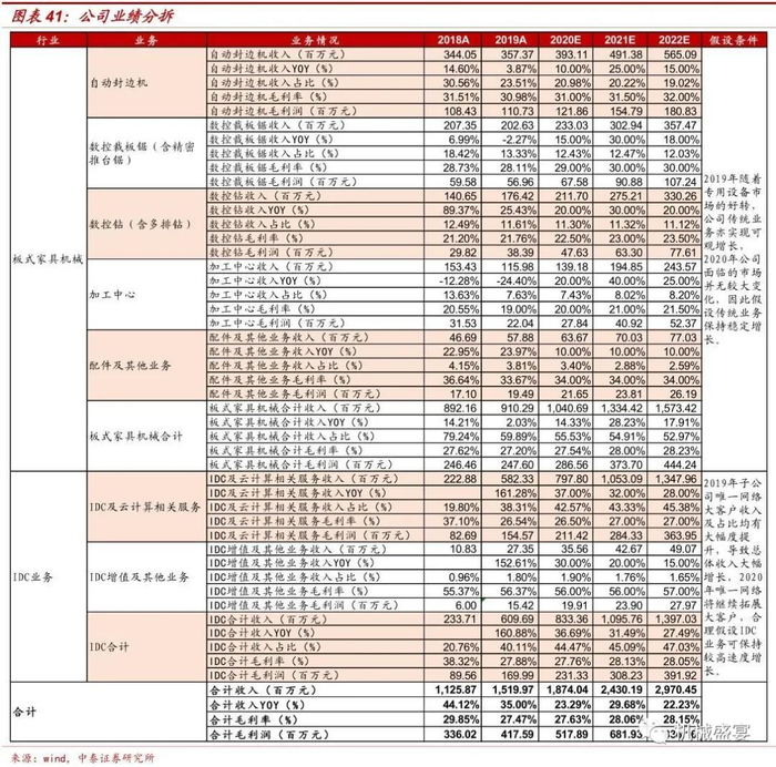 (3)公司是国内板式家具生产设备的领军企业,在行业中处于领先地位。随着行业逐渐趋于成熟,投资增速趋缓,不需要大规模的资本性投入,专用设备业务成为公司现金牛业务,为公司拓展IDC业务提供了充足资金。