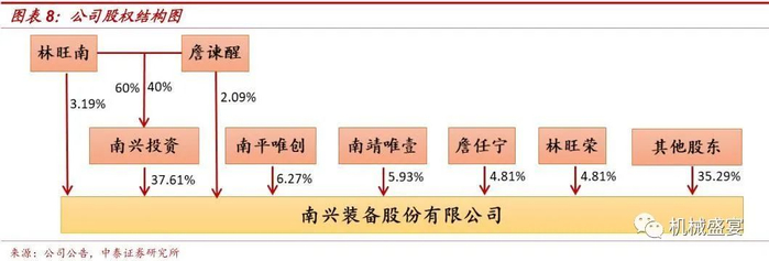 林旺南先生与詹谏醒女士是夫妻关系,为公司实际控制人和一致行动人,共直接持有公司5.28%的股份,并通过持有控股股东南兴投资100%的股权间接持有公司37.61%的股份,合计持有公司42.89%的股份。詹任宁与詹谏醒为兄妹关系,林旺南与林旺荣为兄弟关系,除此之外,其他股东之间不存在关联关系。此外,公司于2017年向核心技术人员等激励对象授予220万股,占当时公司总股本的2.01%,授予价格为20.72元/股(根据分红调整),通过对员工进行股权激励,有望调动员工积极性,利好企业长远发展。