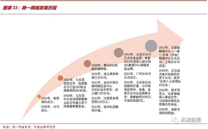 增资控股志享科技,业务模式开始向自建数据中心转变。2018年12月14日,唯一网络支付对价4230万元收购广东志享科技47%股权,本次收购完成后,唯一网络在志享科技的股权比例增至75%,志享科技将成为唯一网络的控股子公司。目前公司主要采用租用运营商机房的模式运营,自有机房为“唯一·志享(华南)数据中心”,该机房计划配置超过3300个标准机柜。截止至2019年年末,公司已完成东莞自建数据中心的二期建设,完成自建数据中心机柜数超过2500个,大部分已预售完毕。根据客户需求及市场趋势,紧跟国家倡导的“新基建”布局,唯一网络计划在2020-2024年在东莞及北上广深等核心热点城市,通过自建、并购、合作等多元化方式完成数据中心建设计划,以保障公司中长期战略实施以及经营目标的实现。