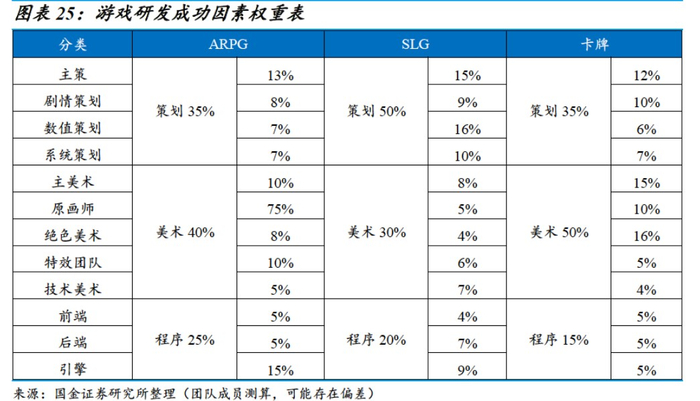 国金证券研究发现以系统性成功率较高的品类为例,从ARPG、SLG和卡牌类研发成功率分析看,“美术工艺”平均决定游戏研发40%的成功率。