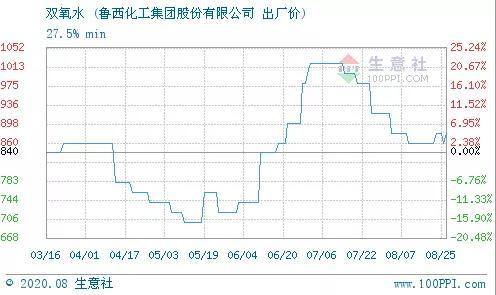 先来回顾下双氧水近期走势。8月初,由于终端己内酰胺行情开始下行,造纸行业行情涨势陆续趋于稳定,己内酰胺厂家和纸业备货行情结束,采购双氧水热情逐步下降,采购量减少,开启了大幅下跌的行情。主流报价已经跌至900元/吨一线,跌幅超过4%。