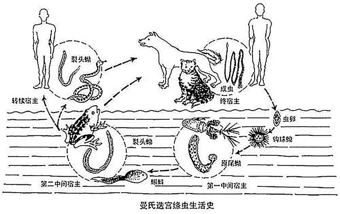 所谓裂头蚴其实是曼氏迭宫绦虫幼虫的一种形态,这类寄生虫的生活史相对复杂。曼氏迭宫绦虫的成虫寄生在终宿主的肠道内,受精繁殖,虫卵经子宫孔产出,随粪便排出体外。