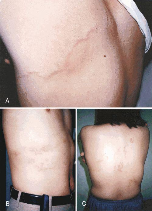 所以颚口线虫感染的症状不固定,可以出现在全身各处,在额、脸、枕、耳、眼、手、颈、胸、乳房、子宫、腹及背等处皆有发现,最让人毛骨悚然的是它在表皮与真皮间游走,形成隧道,造成红肿瘙痒疼痛等症状。