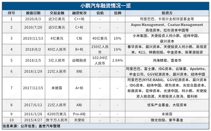 根据盖世汽车不完全统计,自创立以来,小鹏汽车已经历了11轮融资,累计融资金额或已超过163亿元人民币,其背后投资者既有全球消费电子和互联网领域的战略投资者,同时也包含了知名私募基金和企业家投资者。