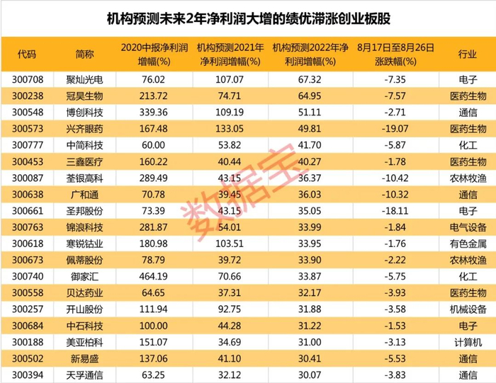 统计显示,8月17日以来跑输创业板指,今年中报净利润增幅(预告以下限计算)超50%,且机构预测2021年、2022年净利润增幅有望超过30%的创业板股,共计19只,医药生物、通信股居多。