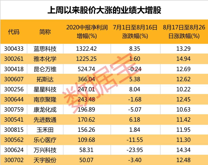 不过万兴科技今年中报实现净利润0.89亿元,同比增长58.31%,普利制药、新天科技上半年业绩均有不同幅度上涨。蓝思科技7月1日至8月16日上涨8.35%,小幅跑输创业板指,8月17日以来股价上涨13.29%;雅本化学7月1日至8月16日涨幅仅有1.6%,8月17日以来涨幅接近15%,2家公司上半年净利润增幅均超过10倍。