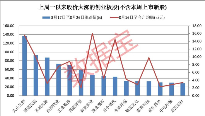 当然,创业板近期大涨的不仅仅是天山生物,证券时报·统计显示,剔除本周上市新股,自上周一以来(8月17日至8月26日),117股涨幅超10%,27股涨幅超过20%。除位居首位的天山生物外,坚瑞沃能、西部牧业、汇金股份等5股区间内涨幅均超过50%。海能实业、田中精机、永清环保等股区间内涨幅超过30%。