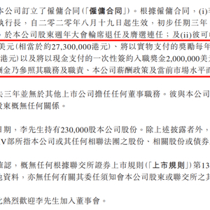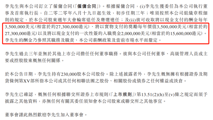 除了每年700万美元的报酬,中国生物制药还宣布,于公告日期,李一持有230000股本公司股份。