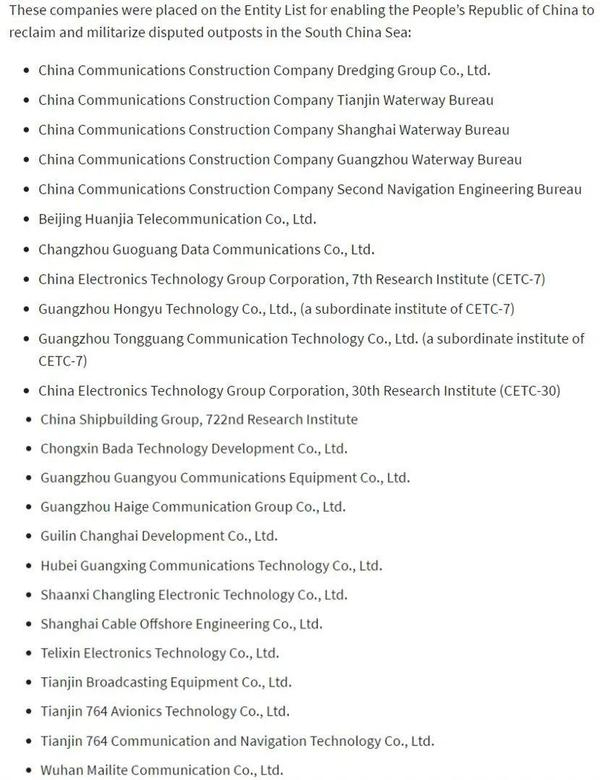 当地时间8月26日,美国商务部网站宣称将24家中国企业列入制裁名单,限制其获取美国技术,原因是这些企业“帮助中国军方在南海修建人工岛”。美国商务部长罗斯表示:“美国、中国的邻国以及国际社会指责中国对南海的主权主张,以及为中国军方修建‘人工岛’。今天被指定的这些实体在‘人工岛’建设中发挥了重要作用,必须被追究责任。”