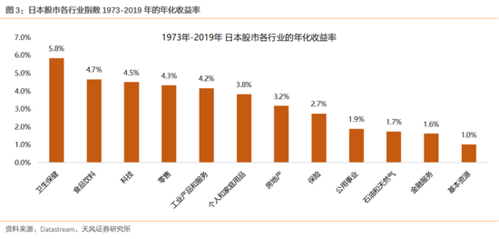 日本经济社会、股市发展与美国不可同日而语,但股市长期收益率最高的板块依然是消费与科技。1973-2019年,日本股市中年化收益率最高的三个行业:卫生保健(+5.8%)、食品饮料(+4.7%)、科技(+4.5%);年化收益率最低的三个行业:基本资源(+1.0%)、金融服务(+1.6%)、石油和天然气(+1.7%)。