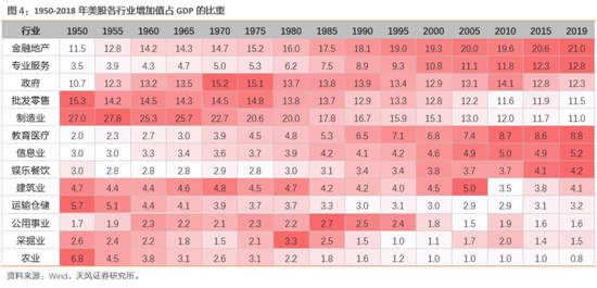 美国方面,1950年以来,行业增加值占GDP的比重趋势性提升的行业有:金融地产、专业和商业服务、教育医疗、信息业、餐饮业;占比趋势性回落的行业有:批发零售、制造业、建筑业、运输仓储、农业、采掘业等。