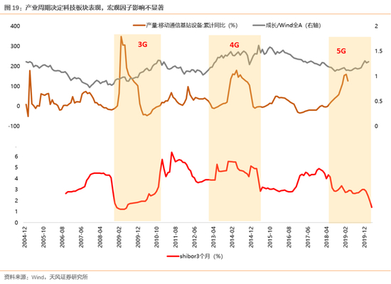 对于A股的科技板块而言,产业周期(而非宏观因子)同样是影响估值泡沫的重要因素。随着4G牌照在2013年下发与移动基站设备建设进入高峰,中国正式进入4G时代,A股的科技板块也正式进入到快速增长阶段:2013-2015年间通信、计算机、电子、传媒板块分别上涨201%、360%、237%、310%,估值和盈利迎来了戴维斯双击(电子盈利+49%、估值+103%,计算机盈利+191%、估值+58%,通信盈利+67%、估值+102%,传媒盈利+109%、估值+96%)。与此同时,在2013年科技板块行情启动时,shibor3个月利率甚至还在一路走高至5%以上,这也进一步验证了在大的产业周期展开之时,宏观因子对于科技板块的影响较弱,而产业周期是决定科技板块估值泡沫大小的重要因素。