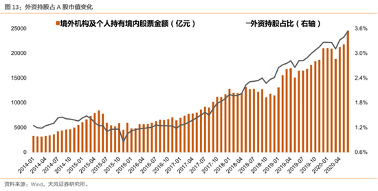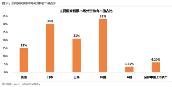 虽然外资流入A股会阶段性被全球宏观环境的变化打断,但是更长期来看,从流入空间的角度出发,未来外资继续加配核心资产的趋势还没有结束,这都会对优质的消费公司形成估值支撑。截至Q2,根据央行数据,全部外资(北上+Qfii等)共持有A股市值2.46万亿,占全部A股市值的3.55%、占流通A股市值的4.74%。而如果考虑广义的中国资产,除去A股上市公司外,中国还有大量优质资产在其他交易所上市,比如中概股、港股中资股,经过我们测算,外资持股占总市值(全部中国上市资产)比重约6.2%。而横向比较来看,即使计算广义上的中国资产,外资持股占比在全球范围内仍然较低,不仅低于美、日等发达国家,和巴西等新兴国家相比也差距较大。因此,再考虑MSCI纳入因子仅提升至20%,外资流入的空间仍然较大,这也将对中国的核心资产估值形成长期支撑。