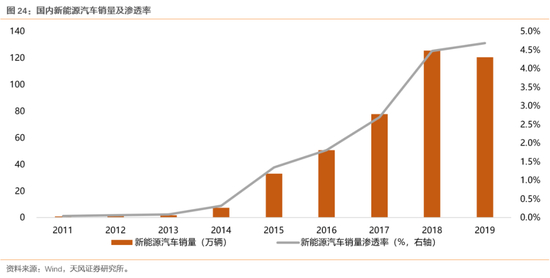 一方面,在全球新能源汽车产业周期与全球5G产业周期共振的情况下,新能源汽车与无线蓝牙耳机有望随着销量提升而迎来渗透率的快速提升。根据中国储能网数据,2019年全球新能源汽车销量为220万辆,市场份额大概在2.5%左右;而2019年我国汽车销量2577万辆,其中新能源汽车销量120.6万辆,新能源汽车渗透率仅为4.68%。根据工信部新能源汽车产业发展规划(2021-2035年),2025年新能源汽车渗透率将达到25%,预计国内未来新能源汽车市场增长空间广阔。