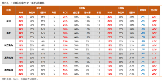 在DCF或者DDM的估值体系下,当消费股的业绩和ROE相对稳定时,贴现率因子的下降,将会非常显著的提升消费板块理论估值的上限。我们以几支白马A股为例,如下表假设,在9%的贴现率要求下,茅台在ROE分别为30%、25%和20%的三阶段下,理论PE为32.1倍;而在保持三阶段ROE水平不变的情况下,如果贴现率下降至7%,则理论PE上升至54.6倍。利用同样的方法,我们可以计算出在9%贴现率下海天、美的理论估值为40.2倍和18.7倍,而当贴现率要求降至7%时,海天、美的的理论PE升至74.1倍、29.3倍,理论估值上限提升较为显著。