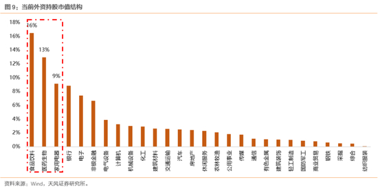 回到A股的消费品公司,在外资持续流入的背景下,随着A股估值体系的变迁,宏观贴现因子也逐渐成为A股消费板块估值的重要影响因素。在此前的A股估值体系中,投资者更加关注短期的业绩增速g,PEG的估值体系深入人心,短期增速决定估值波动,与贴现因子关系不显著。但自2017年外资开始以几乎不变的斜率流入A股以来,外资挑选了A股中的一部分核心资产,特点是ROE具备稳定性和可持续性,于是这部分公司被认为是A股中最有可能实现“永续增长”,并且可以按照DCF或DDM折现模型来估值的股票。从目前外资持股结构来看,食品饮料、医药生物、家电等消费板块持股市值占比加总接近40%。