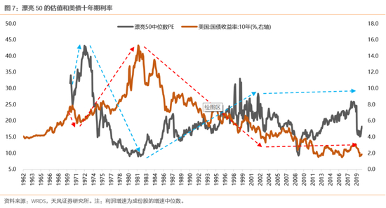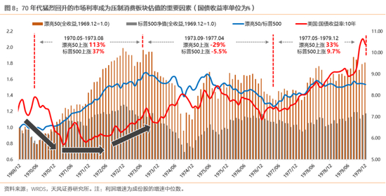 在报告《50年复盘:美股的诗和远方如何消化高估值?》中,我们回顾了美股“漂亮50”在70年代估值消化的过程。自1973年开始,此前表现优秀的“漂亮50”估值下杀了近80%,而其盈利增速较估值下杀前并无较大的变化,整个1970年代仍然稳定在15%-20%附近。这也表明,对于微观盈利能力较为稳定的消费板块,宏观利率环境、贴现因子成为影响估值泡沫变化的重要影响因素。