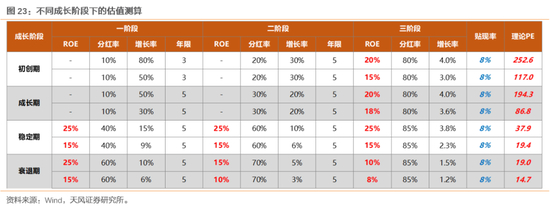 从理论估值模型中,我们也可以得到类似的结论,在当前科技板块普遍估值水平较高的情况下,对应处在不同产业发展阶段的企业,理论估值水平(估值容忍度)也不同。我们同样做一个具体的假设,在贴现率8%的水平下,按照三阶段发展进行理论PE计算: