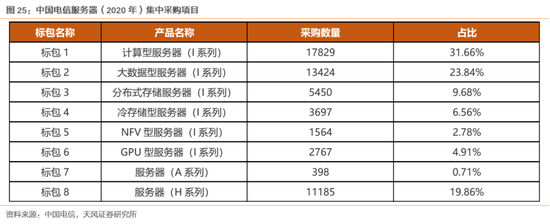信创领域,硬件看芯片,软件看操作系统、办公软件。信创领域的国产替代同样是一个循序渐进的过程,但中长期看市场容量巨大,国内头部厂商将持续受益于国产化推进。短期来看,涉及国家安全的党政办公系统国产替代有望取得进展。5月以来运营商、国有大行的招标情况也显示,党政办公系统的招标情况超出市场预期。其中具有代表性的事件是中国电信发布的2020年服务器招标集采情况,全国产化的H系列(CPU类型为鲲鹏920系列或中科曙光海光系列的处理器)占比19.86%。首次进行全国产化服务器招标即获得19.86%的比重,或预示服务器国产化替代进程加快。