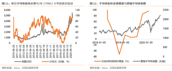 过去一年,类似上图前三行的典型例子就是半导体板块。自2019年半导体周期回暖以来,费城半导体指数持续回升,半导体板块业绩也从底部开始改善,业绩增速在2019年年报上升至87%,PE(TTM)历史分位(十年来)也上升至80%。但在强产业周期的支撑下,半导体板块的业绩增速仍然在进一步快速增长,2020Q1继续回升至96%,这也推升了其PE(TTM)继续上升。