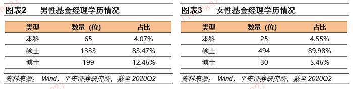 具体到性别来看,无论男性还是女性基金经理,硕士学位的基金经理占比均最大,博士其次,本科占比最少。