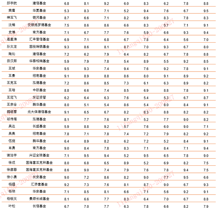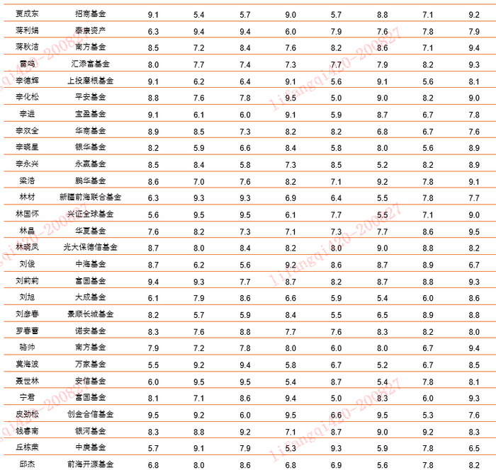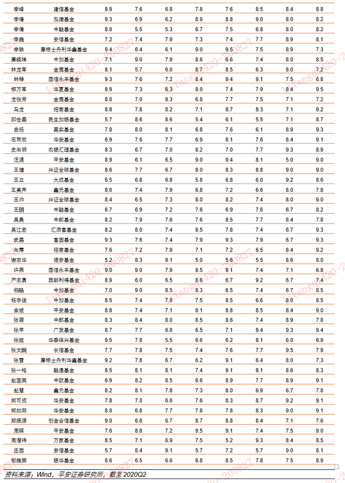 各赛道基金经理的多因子评估的结果数据参考下文,由于数据采用量化模式,并且数据的计算周期为2018年7月1日到2020年6月30日,结果仅供参考。同时由于篇幅所限,仅展示部分基金经理的数据(按照姓名首字母由小到大排序),如需要全部数据,可以和平安证券联系沟通。