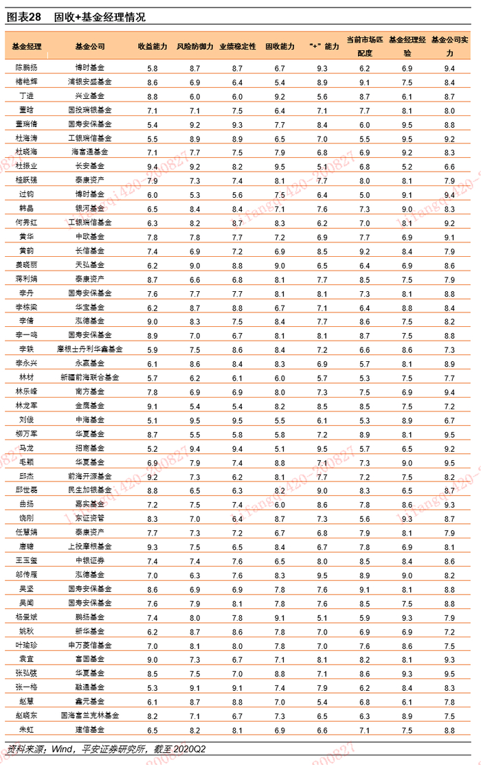 在《【平安证券】基金深度-债券基金系列研究(中):泛二级债基业绩归因和优选20200625》中,我们通过基金持仓和对应股票收益,将固收+基金收益分解为股票收益、转债收益和债券收益。在对固收+基金经理进行分析时,我们采用类似的方法进行分析。首先分解出基金经理的股票收益、转债收益和纯债收益,并估算考察期间固收+基金经理所有基金在股票、转债和债券上的仓位。最后,将分解出的收益与对应仓位相结合,计算出基金经理在股票、债券和转债上的实际收益。对于固收+基金经理而言,债券收益为固收收益,股票收益加转债收益为“+”收益。
