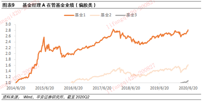 在分析基金经理的时候,最主要的问题是需要判断基金经理的管理业绩,通常采用的方法是观察该基金经理所管理基金的业绩。但如果该基金经理同时管理多只产品,出现管理时间区间不一致,业绩表现不一致的时候,就非常难以判断。比如下图的基金经理A,截至2020年6月30日,共管理3只偏股型基金。那么业绩表现如何呢?