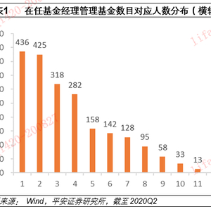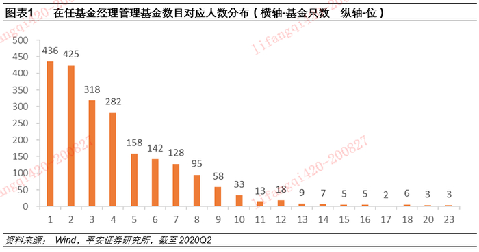 截止2020年二季度末,公募基金一共有4022位基金经理(包含历史上的全部从业者),最新在职2146位。其中,有436位基金经理仅管理1只基金,有425位仅管理2只,318位管理3只。管理5只以下(含)的基金经理占全部基金经理的75.44%。管理基金数目最多的基金经理同时管理了23只基金。
