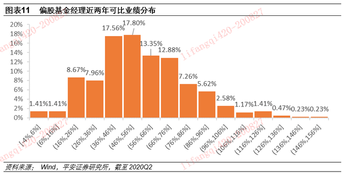 通过基金经理的业绩指数化,可以对全市场所有的基金经理进行对比分析。以偏股型基金经理为例,截至2020年6月30日,我们计算了近两年的基金经理业绩表现。全部同期可比的基金经理,近两年平均业绩为56.33%,远超沪深300同期18.60%的涨幅。从业绩分布看:1)17.56%的基金经理业绩分布在36%-46%(含)之间,17.80%的业绩分布在46%-56%(含)之间;2)只有3.51%的基金经理业绩在106%以上;3)业绩最高的达154.31%,最低的仅为-3.81%。