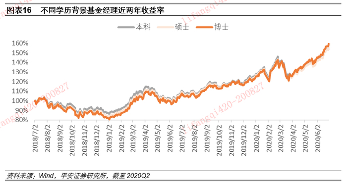 从学历方面分析看,我们也发现取得博士学位基金经理的业绩,仅略高于硕士和本科学位的基金经理,整体差异并不明显。