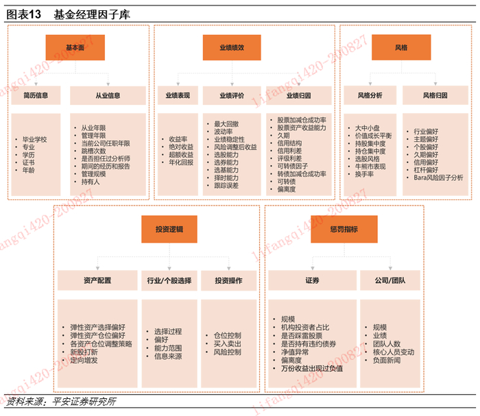 综合基金经理分析中涉及到的定性和定量等全部数据,我们将基金经理的影响因子划分为5大类型:基本面、业绩绩效、风格、投资逻辑和惩罚指标。