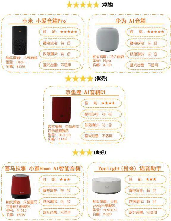 综合测试结果,小米、华为、天猫精灵和小度在家4款样品在本次比较试验中获评五星;京鱼座和腾讯叮当2款样品获评4星;喜马拉雅、yeelight(易来)、苏宁极物3款样品获评3星;飞利浦智能无线音箱(AW6005A/93)经检测无智能语音交互功能,不计入本次评价。