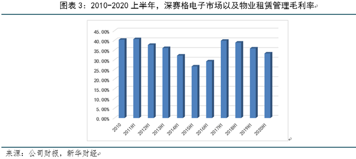 深赛格电子市场流通业务受三方面冲击:一是全球经济下滑,外贸困难;二是新冠疫情冲击,消费习惯线下转线上;三是传统电子行业加速向配套服务转变,物业租赁管理营收下滑。2020年上半年,深赛格电子市场以及物业租赁管理合计营收432.72万元,较2019年上半年下降14.62%,占比总营收的55.7%,2019年上半年这一比例为66.21%。2010年-2020年上半年,深赛格电子市场以及物业租赁管理毛利率震荡下跌,从2010年的40.37%下降到2020年上半年的33.31%,与深圳商铺租金监测情况基本一致。据第一太平戴维斯数据,受新冠疫情影响,深圳租赁活动放缓,一季度全市空置率环比上涨1.2%到26.2%,租金指数环比下跌1.6%,部分业主通过租金减免的形式稳定商户,二季度租金跌幅收窄。