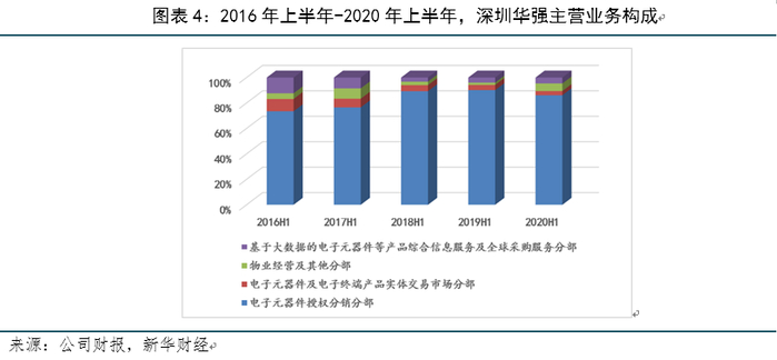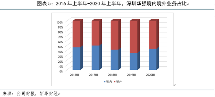 与深赛格类似,之前的深圳华强还是一家业务颇为多元的企业,物业、电商、酒店均有涉及,但近些年业务明显聚焦。2020年上半年,电子元器件授权分销占据深圳华强总营收的86%,这一比例在2016年上半年是72%,电子元器件及电子终端产品实体交易占比越来越小,公司明显聚焦于分销业务。2016年上半年-2020年上半年这四年间,深圳华强境外业务占比高于国内业务。近年来,深圳华强在国内电子元器件分销行业居于前五名。随着电子元器件市场进入存量市场、贸易保护主义抬头、制造业成本上升、半导体产业周期性回落,国内分销市场竞争更激烈,扩大前沿应用领域所需产品代理范围、拓展上游领域是分销龙头的共性措施。