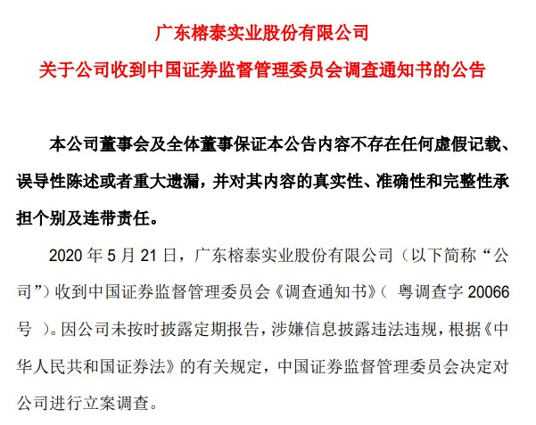 5月21日晚,广东榕泰发布公告称,公司涉嫌信息披露违法违规被证监会立案调查。在起初发布的公告中,公司称因“未按时披露定期报告,涉嫌信息披露违法违规”而被立案调查。