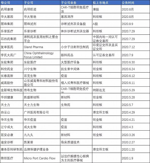 据统计,截止2020年8月上旬,A股和港股医药上市公司中,已有近20家药械企业宣布拟分拆子公司上市。其中包括,丽珠集团、乐普医疗将旗下IVD业务分拆,复星医药分拆仿制药业务,金斯瑞生物分拆CAR-T疗法等。
