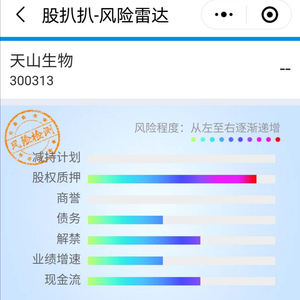 其实,对于个股风险,我们要提前预防,可以用专业的风险排除工具,股扒扒小程序来看一下。比如输入300313,就可以看到天山生物相关信息。