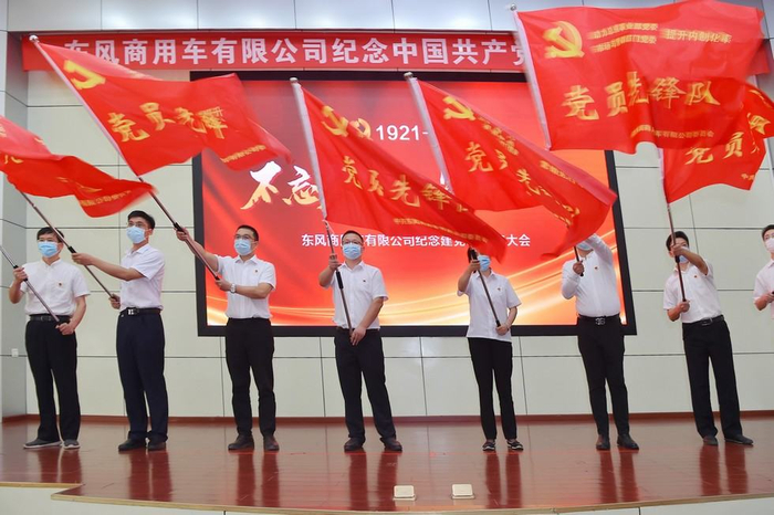 6月30日,东风商用车有限公司纪念建党99周年大会上, 8名党员接下“跨支部党员先锋队”战旗 刘鸿飞/摄