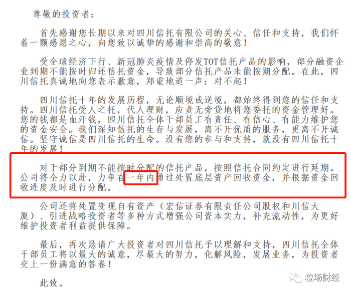 至6月29日,四川信托经过自我核实,并于当晚在官网发布的《致投资者的公开信》。信中首先对出现逾期的项目兑付的行为首先诚恳公开道歉,并为保证投资者的合法权益和积极配合监管局《资管新规》的实施的前提下,给出了“力争一年内”的期许。