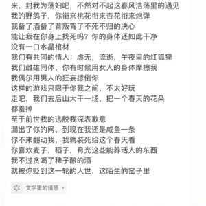 “来,封我为荡妇吧,不然对不起这春风浩荡里的遇见”,诗人敏锐地感知到自己如此粗野且张狂的情欲展现所可能遭遇的典型“荡妇论”的污名,因此先下手为强,先占用这一传统对于那些展示着自身性魅力或是欲望的女性的污名(在《水浒传》中,女性不是荡妇就是男人婆)。然后,诗人对其进行改造和重塑,从而让它获得新的、积极且主动的意义。在宣示自我主体性的同时,破坏传统中关于性别气质与两性情欲的陈词滥调。