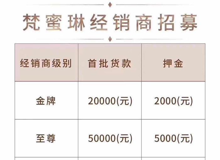 梵蜜琳具有层级经销商的特性,其中金牌经销商押金2000元,首批货款需要20000元,至尊经销商押金和首批货款分别提高至5000元和50000元。此外,总监级别为50万货款加5万押金。