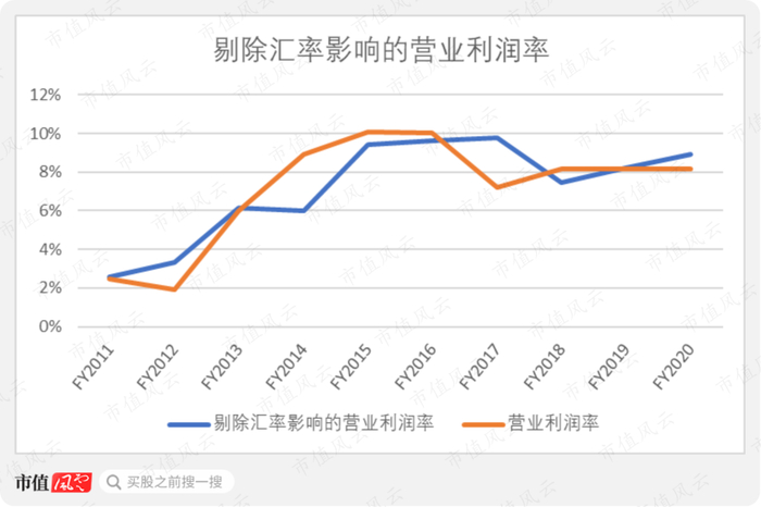 长期来看,剔除汇率影响的营业利润率和剔除前的营业利润率趋于一致。