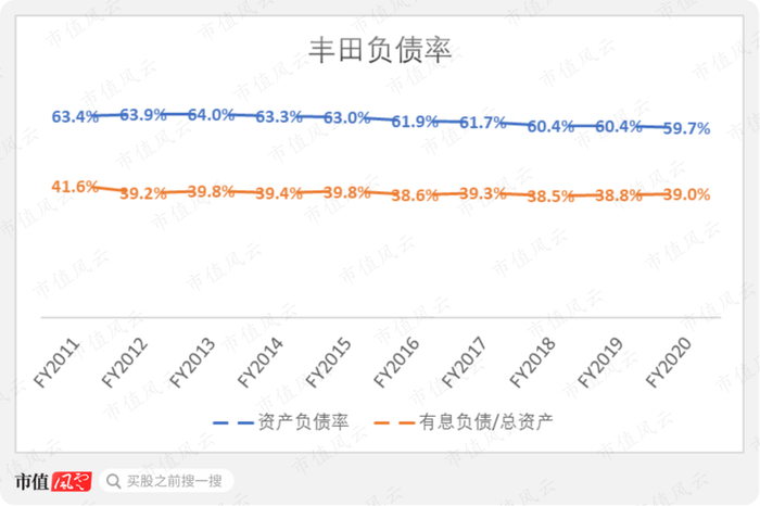 截至2020财年末,丰田的资产负债率为59.7%,有息负债占总资产的比例只有39.0%。资产负债率处于缓慢下滑趋势,有息负债的比例则相对稳定。