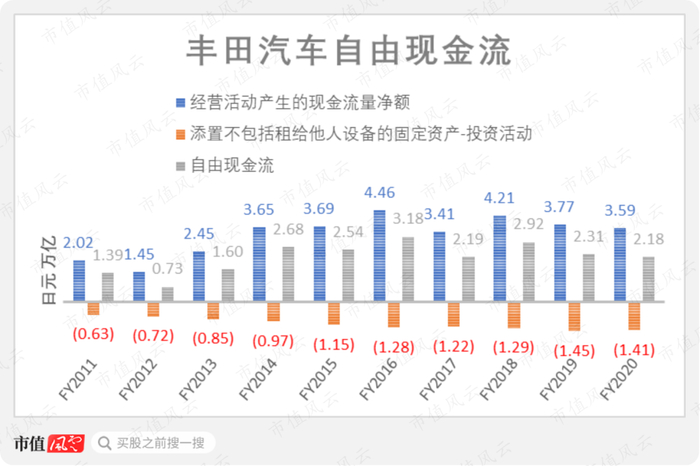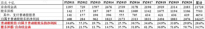 如果以自由现金流来衡量,2011财年以来丰田的自由现金流累计达到21.72万亿、股东回报累计为7.50万亿日元,股东回报占比34.5%。