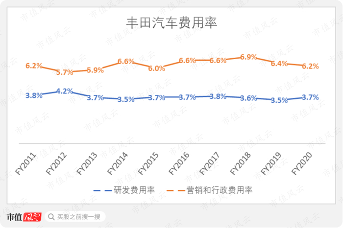 2011财年至今,丰田的研发费用率始终在3.7%左右,非常稳定。